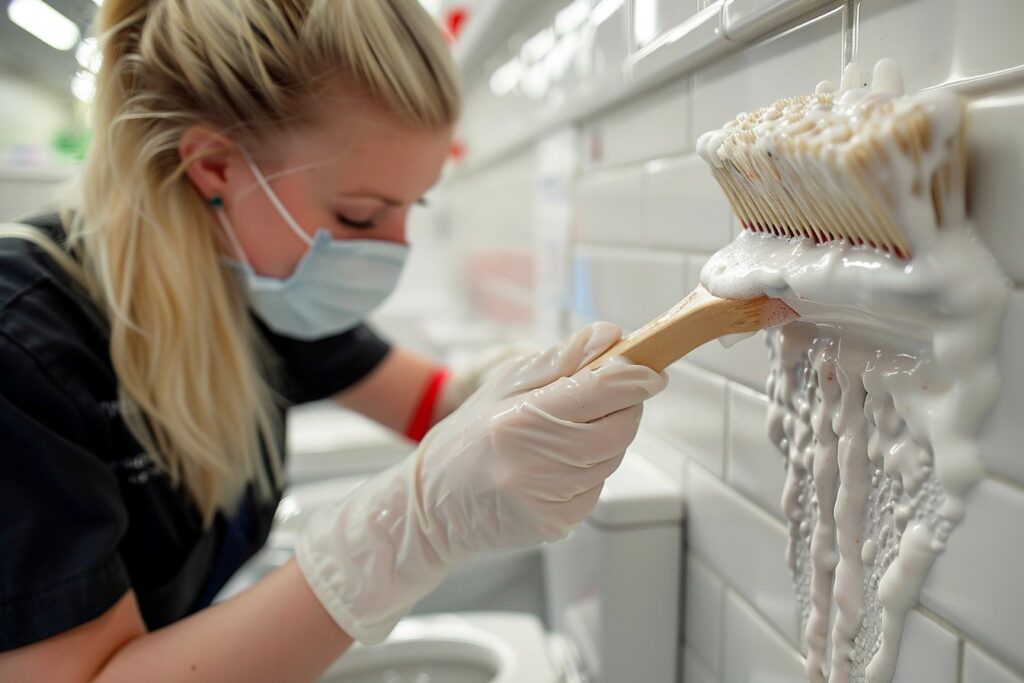 Le récurage du sol doit inclure une solution désinfectante pour s’assurer que même les coins difficiles d’accès sont nettoyés. Passez la serpillière en insistant sur les zones fortement utilisées. Terminez en rinçant avec de l’eau propre et en essuyant le sol pour éviter des glissades.
